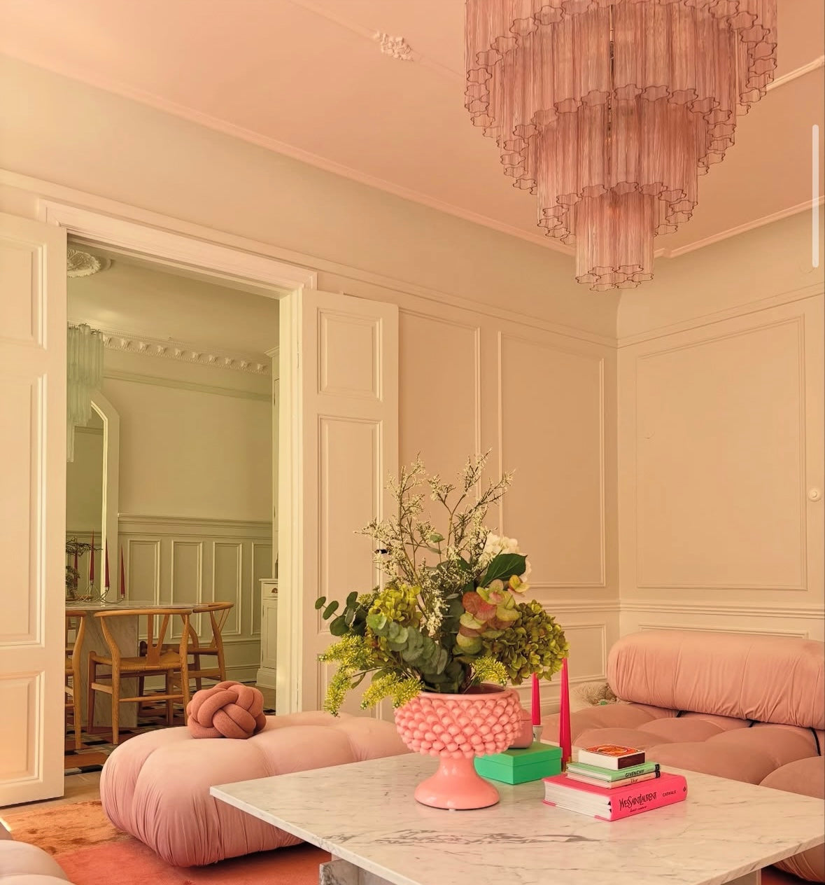 Stor och vacker italiensk takkrona i fyra nivåer som bär hela 78 stycken vackra rosa glasrör. Glasen är tillverkade med en teknik som är typisk för de venetianska glasbruken och ger glasen dess speciella karaktär.